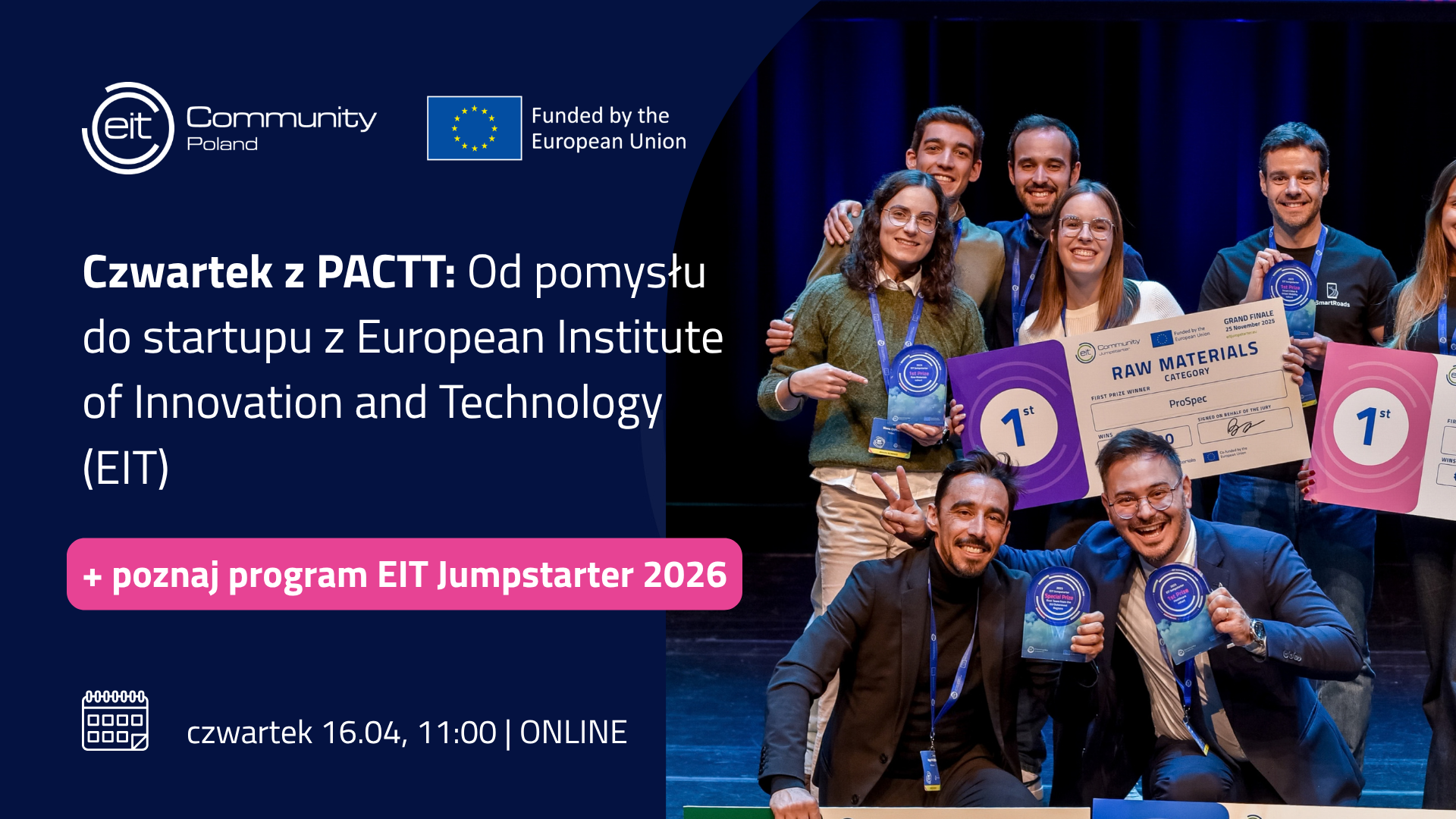 Zapraszamy na spotkanie online z cyklu Czwartek z PACTT, podczas którego poznasz działalność European Institute of Innovation and Technology (EIT) oraz program EIT Jumpstarter – inicjatywę wspierającą komercjalizację pomysłów na bardzo wczesnym etapie.
